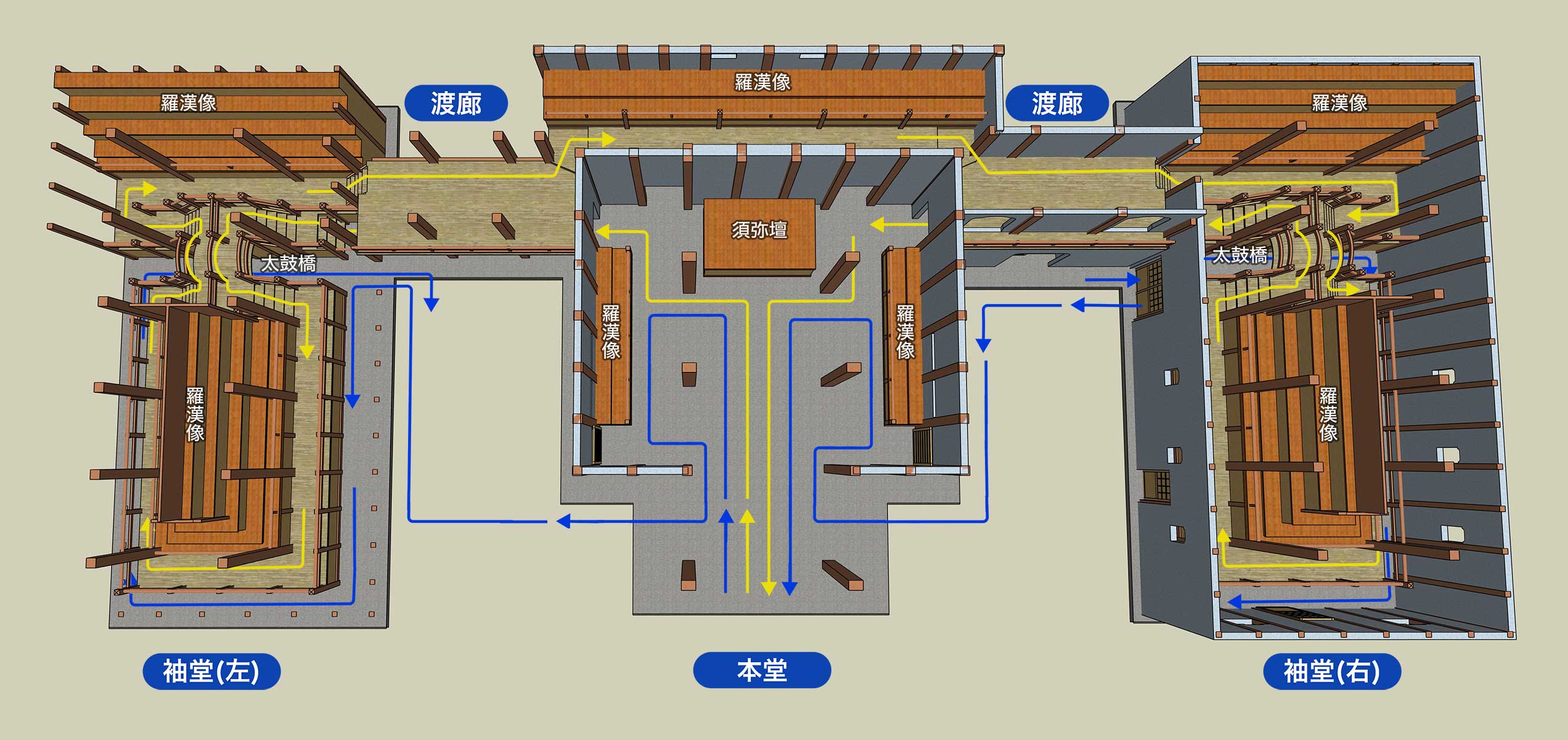 黄色の順路に沿って説明すると、まず本堂に入った参拝者は本堂に入る。須弥壇の左側の戸口から渡廊に入り、左側の袖堂へ移動する。