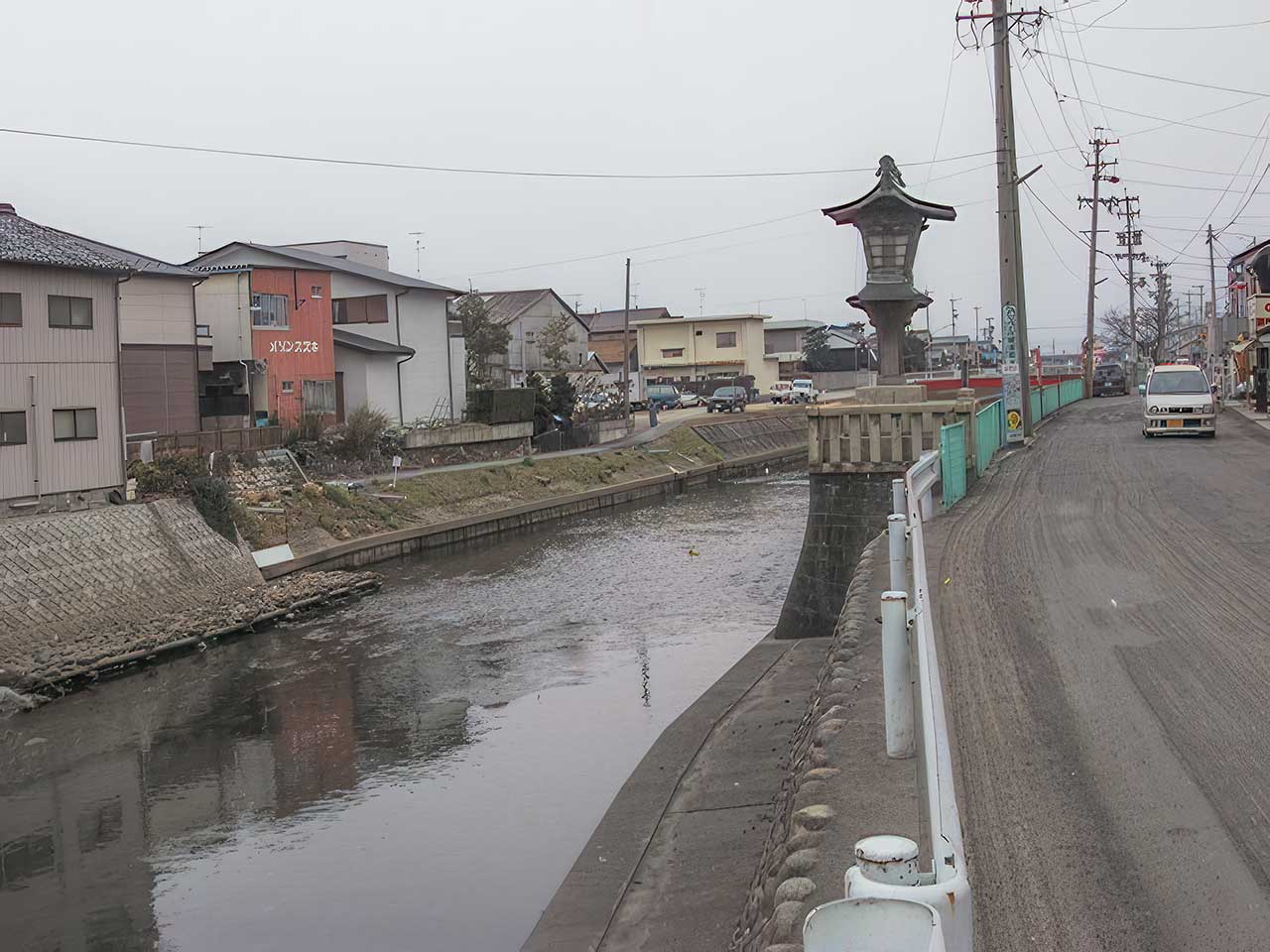 下流から船町河港に入る手前にある常夜灯。もちろん、道を行く人のためのものではなく、川を行く船の目印なのである。
