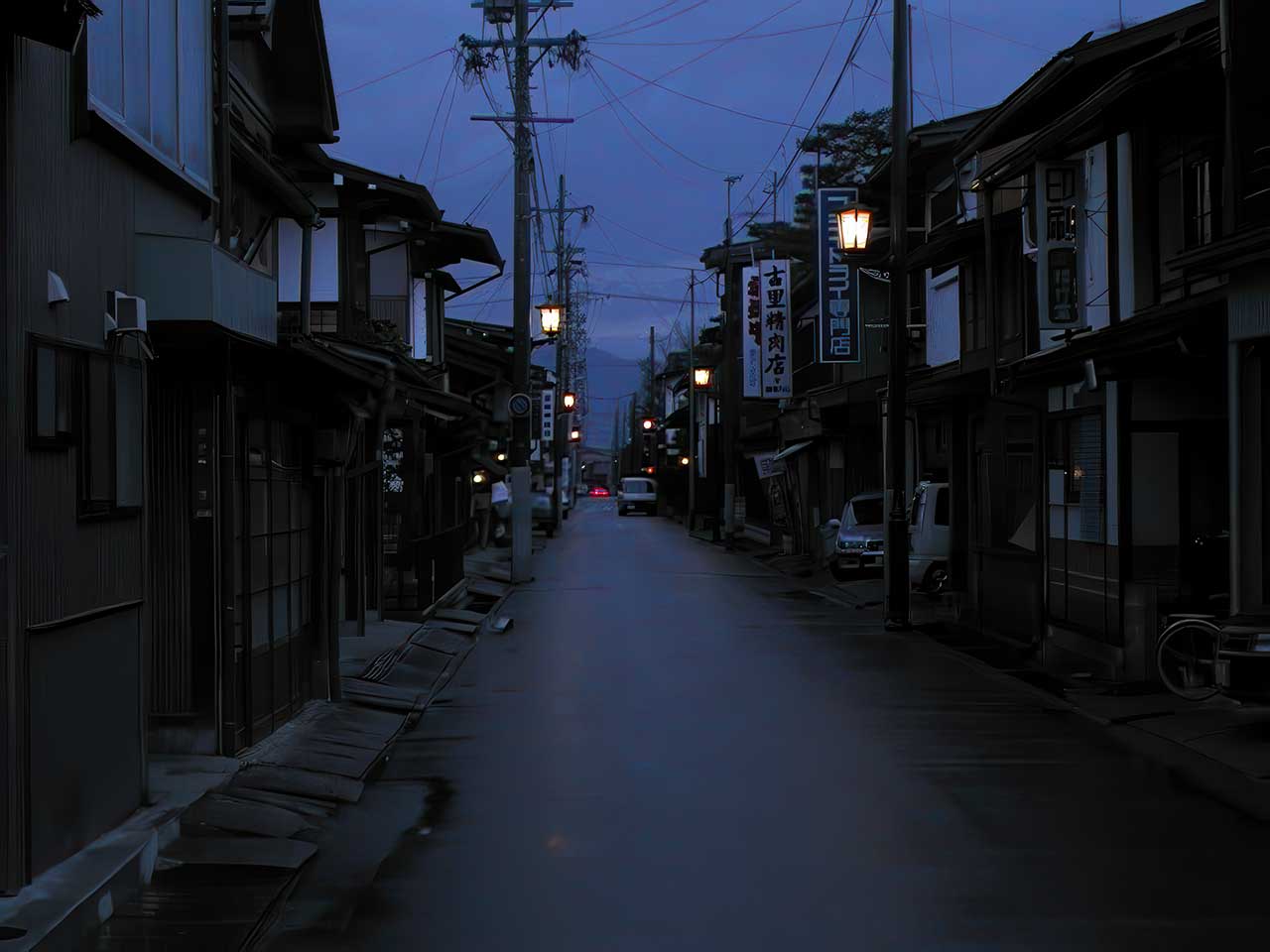 そんなミーハーな観光地にも、日が落ちれば旅愁を誘う街道筋の光景が現出する。
