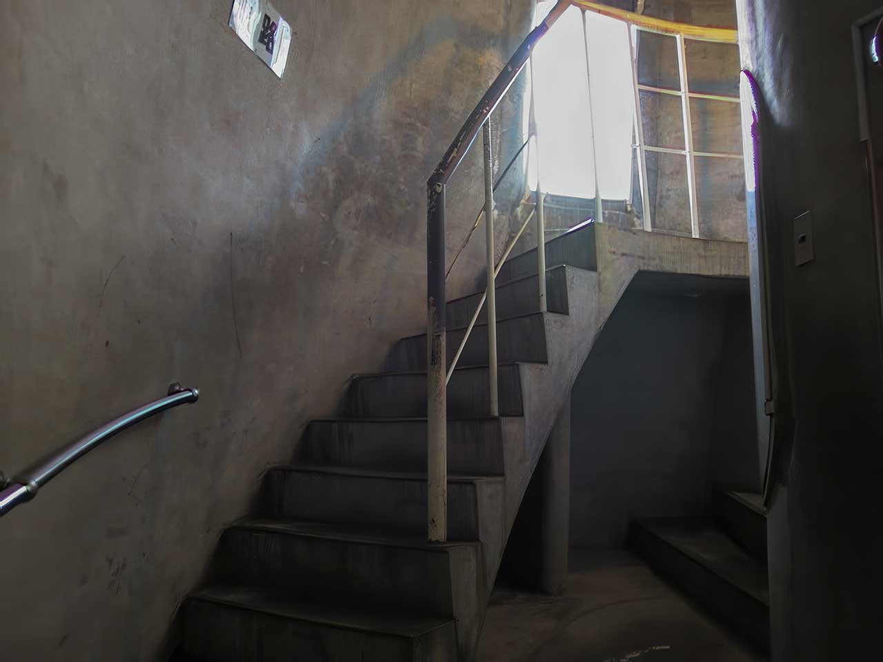 中心には鉄のパイプが通っていて、柱の代わりをしている。柱の周囲は螺旋階段になっていて内部は12階だ。