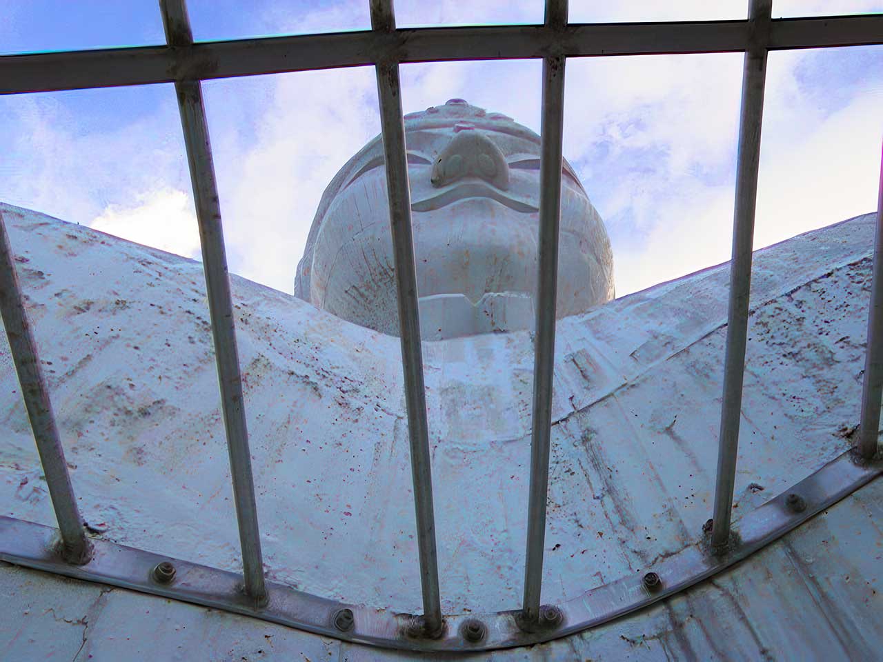 鉄柵一本で魚の背に立つ。こういう無茶さ加減が昭和40年代を感じさせてたまらない。この観音が建てられたのは大阪万博と同じ年。東京タワーに特別展望台が造られた2年後にあたる。高層建築が小宇宙だった時代の最後の残り香である。