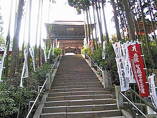 参道は右に折れて石段になっており、二重門と袴腰鐘楼が見えてくる。