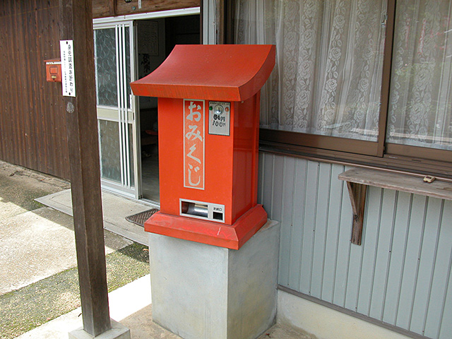 屋根が珍しい片流れタイプ。おみくじの自販機の屋根で多いのは陸屋根、次いで、切妻平入り。片流れ屋根は初出だ。