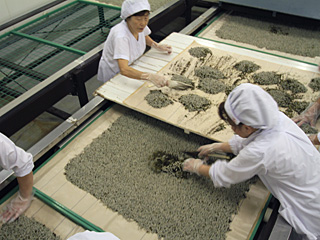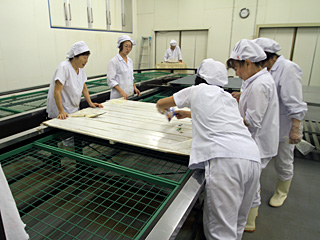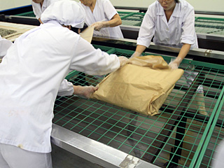 この日行ったのは、ラインの上流で振り込みをしながら、下流で蚕座紙を包んでコンテナに入れるという難易度の高い作業だった。