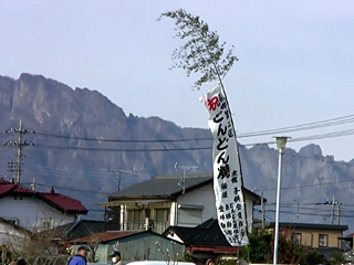 奥に見える山並みは、奇峰、妙義山。このどんど焼きのオープニングでは、妙義大明神が祝詞をあげるのだが、この山から下りてきた天狗なのである。