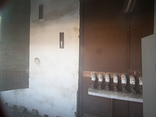 南側の屋根の低い建屋の内部を見ると、さらに2台の乾繭機が並んでいる。おそらく、北側と似た多段バンド式の装置だろう。