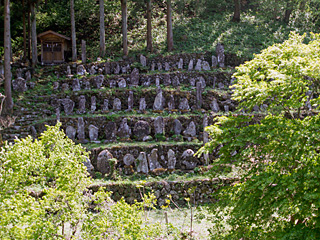 滑岩の集落を過ぎたところの橋の上から、石塔がたくさん並んでいるのが見えた。