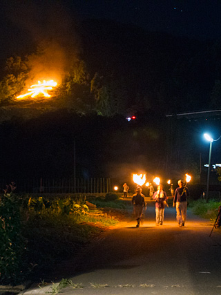 この祭りは火文字を遠目に眺めるだけでなく、このタイマツ行列を見学することもポイントであろう。