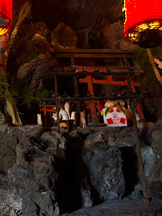 途中の一番暗いあたりに、提灯がともっていて、お稲荷さんが祀られている。