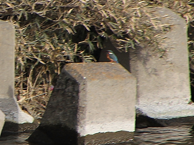 橋から50mくらい下流の消波ブロックの上にカワセミがとまっているのを発見。