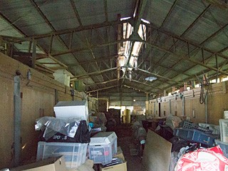 倉庫に使われているようだ。小屋は軽量鉄骨で、屋根はスレート波板葺き。
