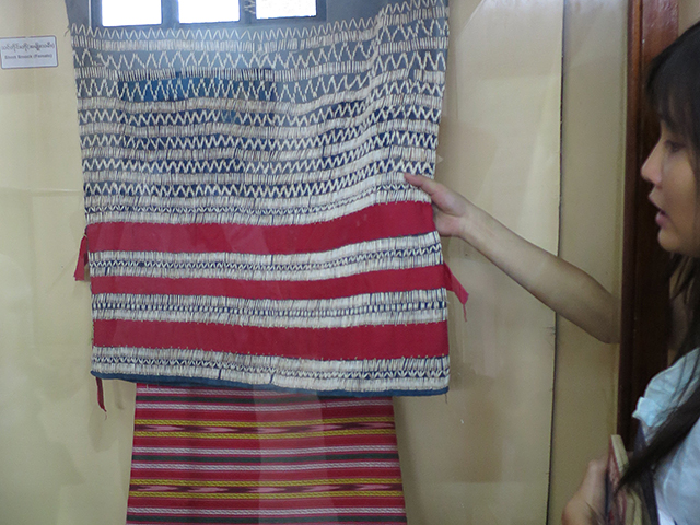 これが、民族博物館に収納されていた古布。学芸員さんがケースを開けて近くで見せてくれた。カレン族の古布は、だいたいこんなふうに赤、青、白の色使いのようだ。