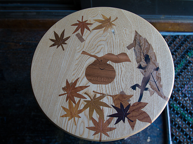 椅子の模様は細かいところまですべて埋め木で描かれている。「埋め木」とは、木の節などが抜けてしまったところに、穴にぴったりに削った木材を埋めて補修するテクニックだ。このテーブルセットはそれを応用して細かい細工をしたもの。