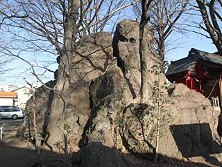 この神社のご神体の大岩は、赤城山、あるいは、浅間山の噴火の際に巨大な岩塊が飛んできてこの場所に落ちたという伝説から「岩神の飛び石」と呼ばれる。