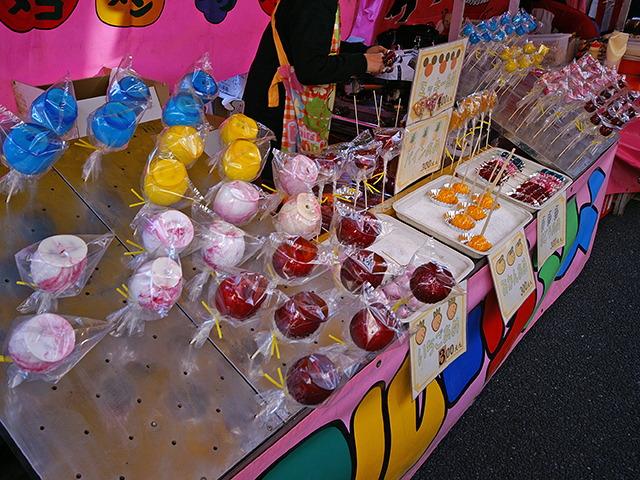 割りばしに差したリンゴに飴をコーティングしたもの。リンゴのみずみずしさと飴の硬さがミスマッチで、とても食べにくいものだが、私は縁日の食べ物では一番楽しみにしていた。めったに買ってもらえない高価な食べ物だった。