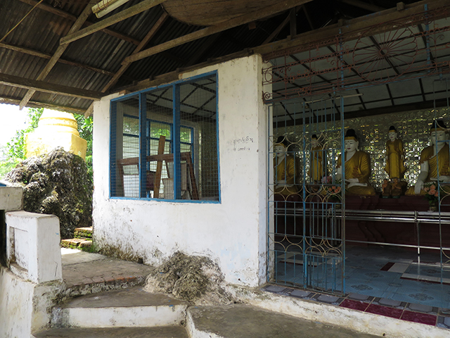ミャンマーのお寺で、なかなか理解できないのが、こうしたクローンのような仏が並んでいるところだ。日本の九体仏などとでは印相が違ったりするのだが、ミャンマーでは印相も同じだ。触地印が多い。