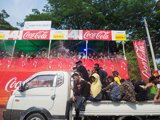 この日は、道を通る人々に自由に水をかけていいことになっている。ヤンゴン市内はバイクやサイカーの通行規制があるため、交通手段は自動車か徒歩になるので、主に自動車と通行人に水をぶっかけることになる。