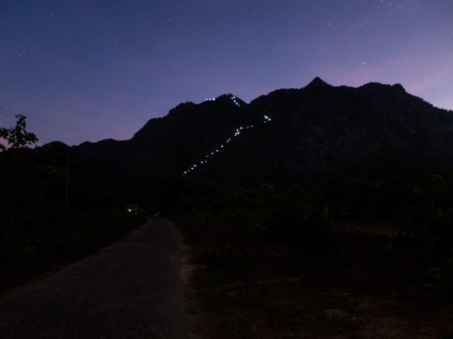 ミャワディ行きはヤギの運び先でいろいろと時間がかかりパアンに帰るころには夜になってしまっていた。その帰路でズェガビン山の東側を通ったとき、参道に明かりが点々とついているのが見えた。ズェガビン東参道は、GoogleMapsで見ると等高線に直角のとんでもない平均斜度の山道で、岩にしがみつきながらの登山になるのではないかと想像していた。