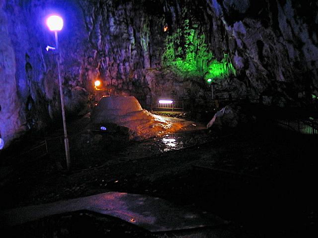 洞内はさまざまな色のライトで照らされている。