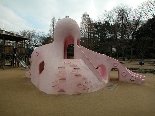 ところがこのタコ山のボディーは無着色のモルタルをコテで仕上げて、ピンクの塗装をしただけなのだ。コテのあとも生々しく残っていて、遊具の仕上げとは思えない粗さだ。
