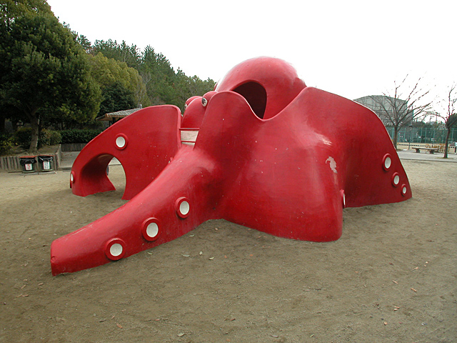 左手の部分には一本だけ長く伸びた触手があるが、ここは滑れるでも登れるでもなく、中途半端なスロープになっている。一応回廊部には切り込みがあるのだが、鉄柵がしてあって小さな子供が落ちないようになっている。もともと何の目的で作られたのだろうか。