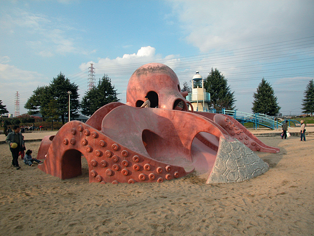 北エリアは海をイメージした遊具で統一されているようだ。このタコは分類上は大ダコなのだが、一目見て異質な感じを受ける。随所に特異点があるのだが、その最大の特徴は頭部に作られた顔であろう。