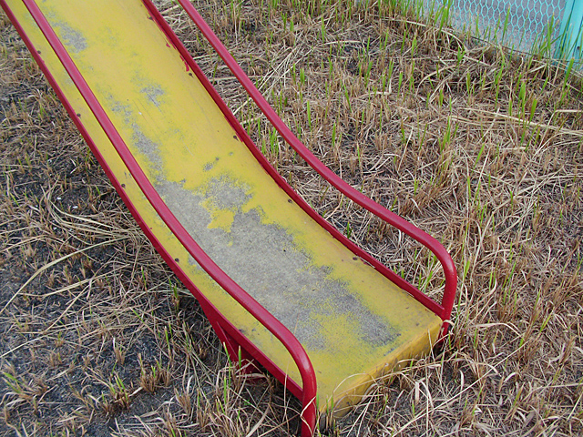 坊の乙女台はこの部分がアクリル板でできていた。どちらが原初の形態なのか判断するのはむずかしいがアクリル板のほうが古いような気がする。その理由は、アクリルは摩擦に弱いので滑り台には向かない材質だ。途中から商品仕様を変更するとしても、エポキシ樹脂→アクリルという仕様改良は考えにくいからである。