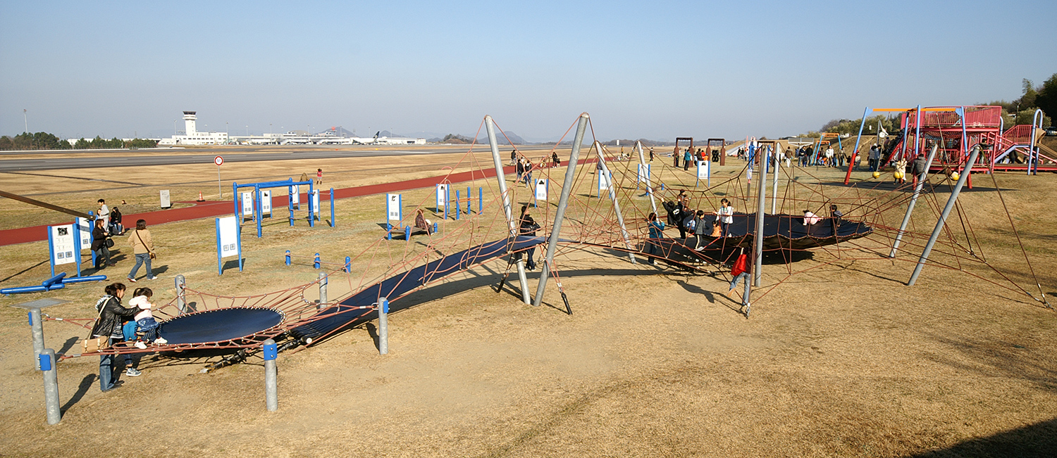 高松空港は山の尾根を削って作られていて、東西方向の滑走路1本からなる。滑走路の東側は崖から飛び出すようなロケーションで、なかなかの迫力。どちらかといえばそのポイントを紹介すべきかもしれない。公園は空港の周囲にいくつか分散してあるが、遊具があったのは滑走路の南側の広場。