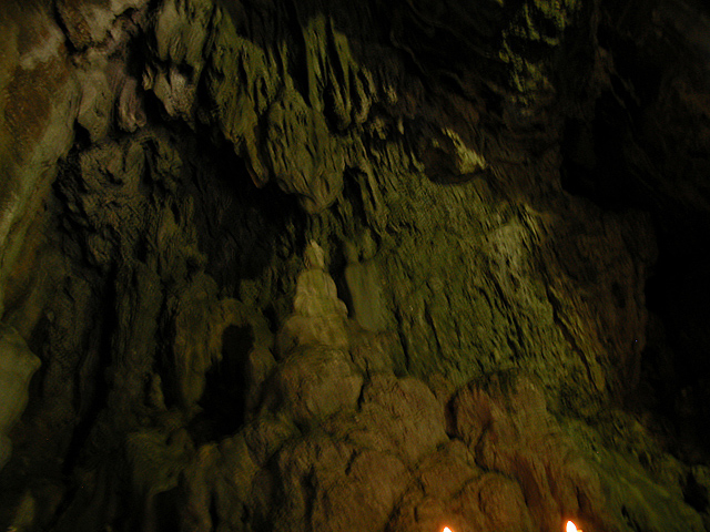 暗くてうまく写っていないが、観音像は石筍の上に置かれていて、二次生成物で癒着している。
