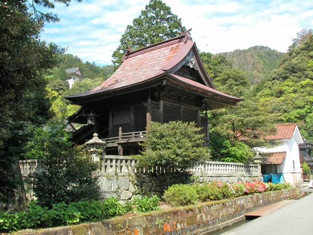 本殿は入母屋妻入りの鉄板葺きで、拝殿から石の間を経てつながっている。