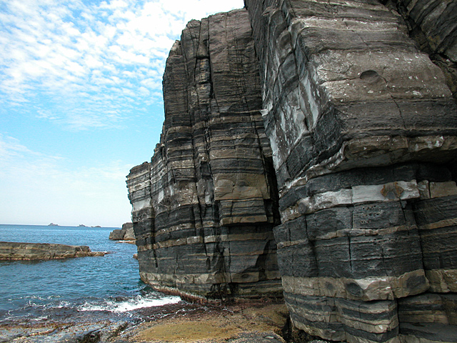 それが縦方向の節理で崩壊して断崖を作っている。高さは15mほどだが、縞模様が細かいため実際より大きく見える。