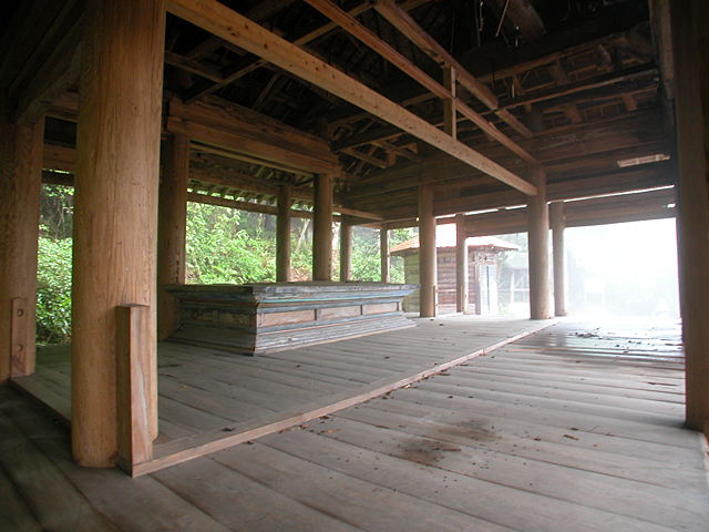 柱のホゾを見るに、ここにも床があったと思われ、密教型式の本堂だったのではないか。つまりこの床が無くなっている部分まで参拝者が立ち入ることができる外陣で、左側の藁座がある部分は地蔵格子、その奥が内陣だったのではないだろうか。