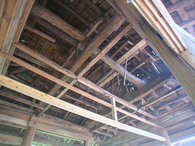 内部を見ると、小屋や貫などには新しい部材も目立ち、何度も補修されてきたのだろう。古いのは柱だけという感じだ。