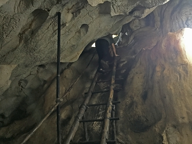 斜めの梯子で登っていくが天井が低く、体をよじらないと進めない厄介なルートだ。バッグなどの手荷物を持っていると汚れそう。