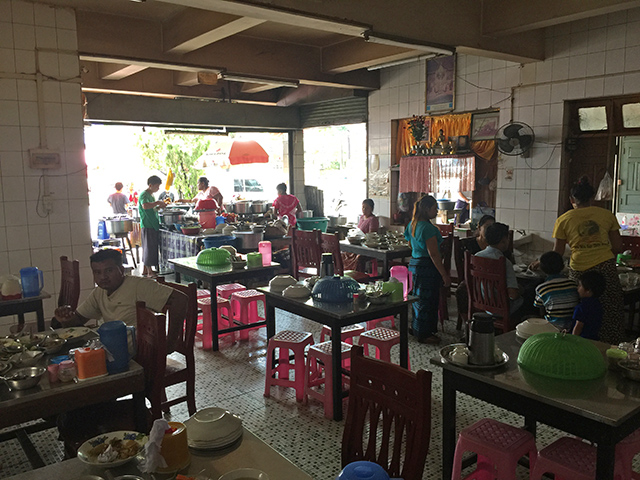 パアン市内、パァヤジー寺院の向かいにあるレストラン。リーズナブルな価格帯でミャンマー料理が食べられる定番レストランで繁盛店のひとつ。