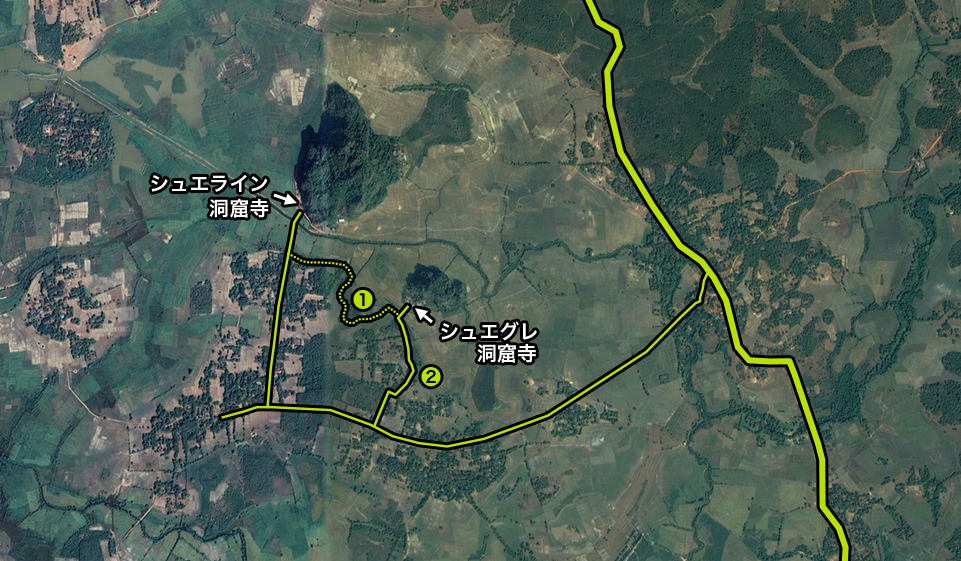 このお寺の行き方なのだが、シュエライン洞窟側から❶のルートで進むことはオススメしない。途中に道がなくえらいことになる。正解は❷のルートなのだが、このルートもお寺の参道という感じではなく村の中の路地でわかりにくい。とにかく道があるかぎり、信じて進むしかない。
