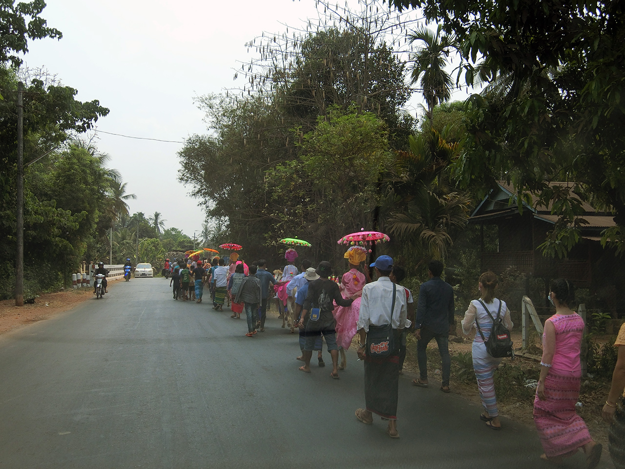 ミャンマーのお坊さんは土色の質素な袈裟を着て、ストイックな修行生活を送っているが、出家式は色鮮やかな衣装を身に着けて飾り立てた馬に乗るのに違和感を感じるかもしれない。