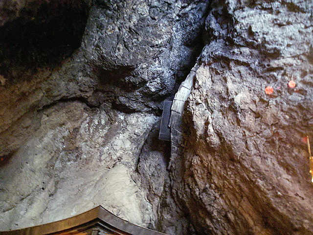 天井を見上げてみると、岩の割れ目に何やらキャットウォークみたいなものが見えるではないか。