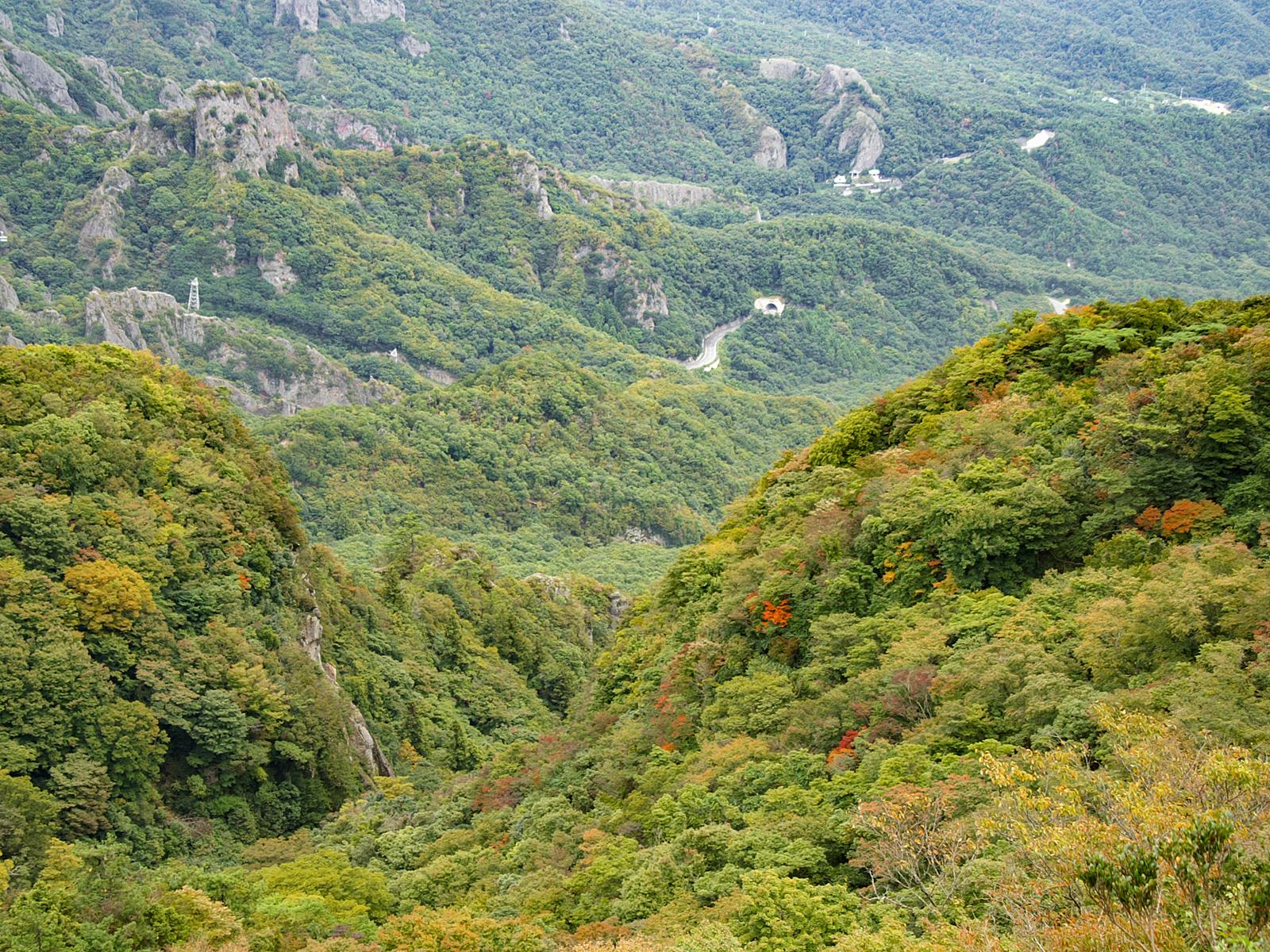 寒霞渓のメインは錦屏風と呼ばれる奇岩群で、ここにはロープウェイがあって峡谷を間近で見ることができる。