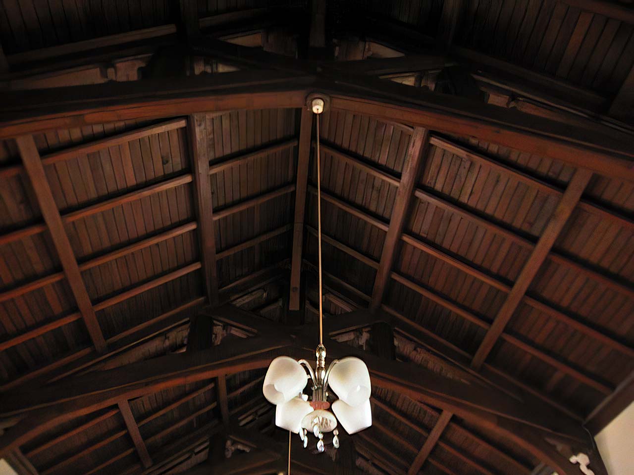 内部に入るとまず圧倒されるのが、ハンマービームと呼ばれる一種のトラス架構。X字型の