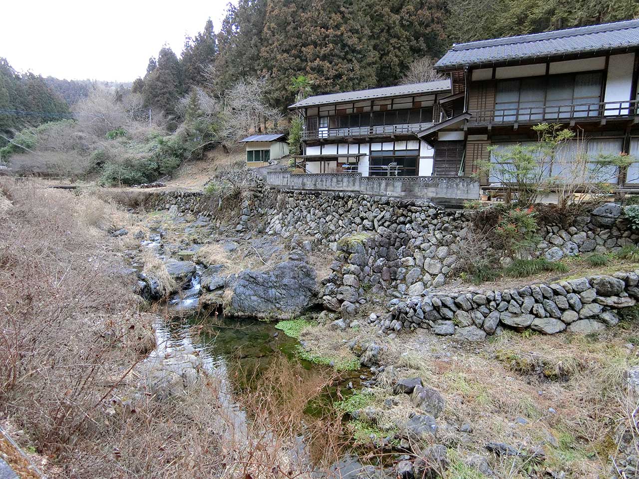 水車小屋跡から日野沢川を少しさかのぼったところに、開けた感じの風景があり、川辺に大きな民家が並んで建っている。