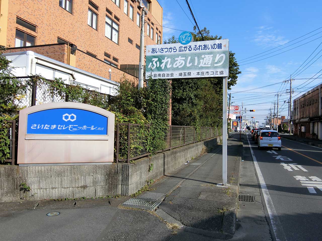 看板には「あいさつから広がる触れ合いの輪 ふれあい通り 小島南自治会・埼玉県・本庄市コミ協」と書かれている。