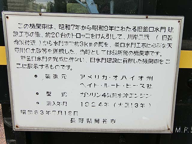 水門の左岸に小さなガソリンエンジンの機関車が展示されている。