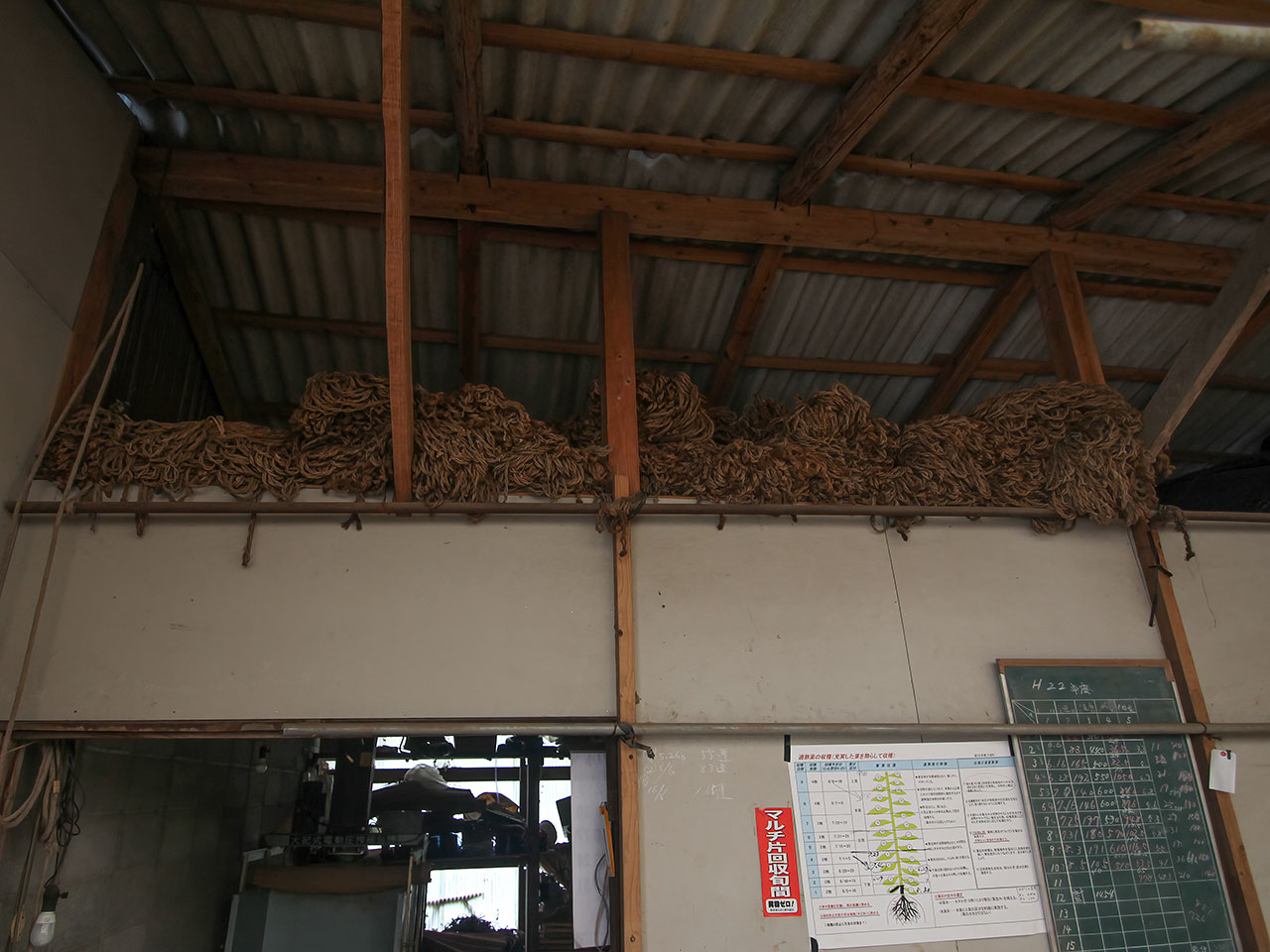 黄色種の乾燥工程だ。温度が70度以上と高温なうえに、5日で終わっている。それと比較すると、お盆から11月まで管理が必要な在来種がいかに作業負荷の高い品種かがわかる。生産農家が減っているのも仕方がないことだろう。