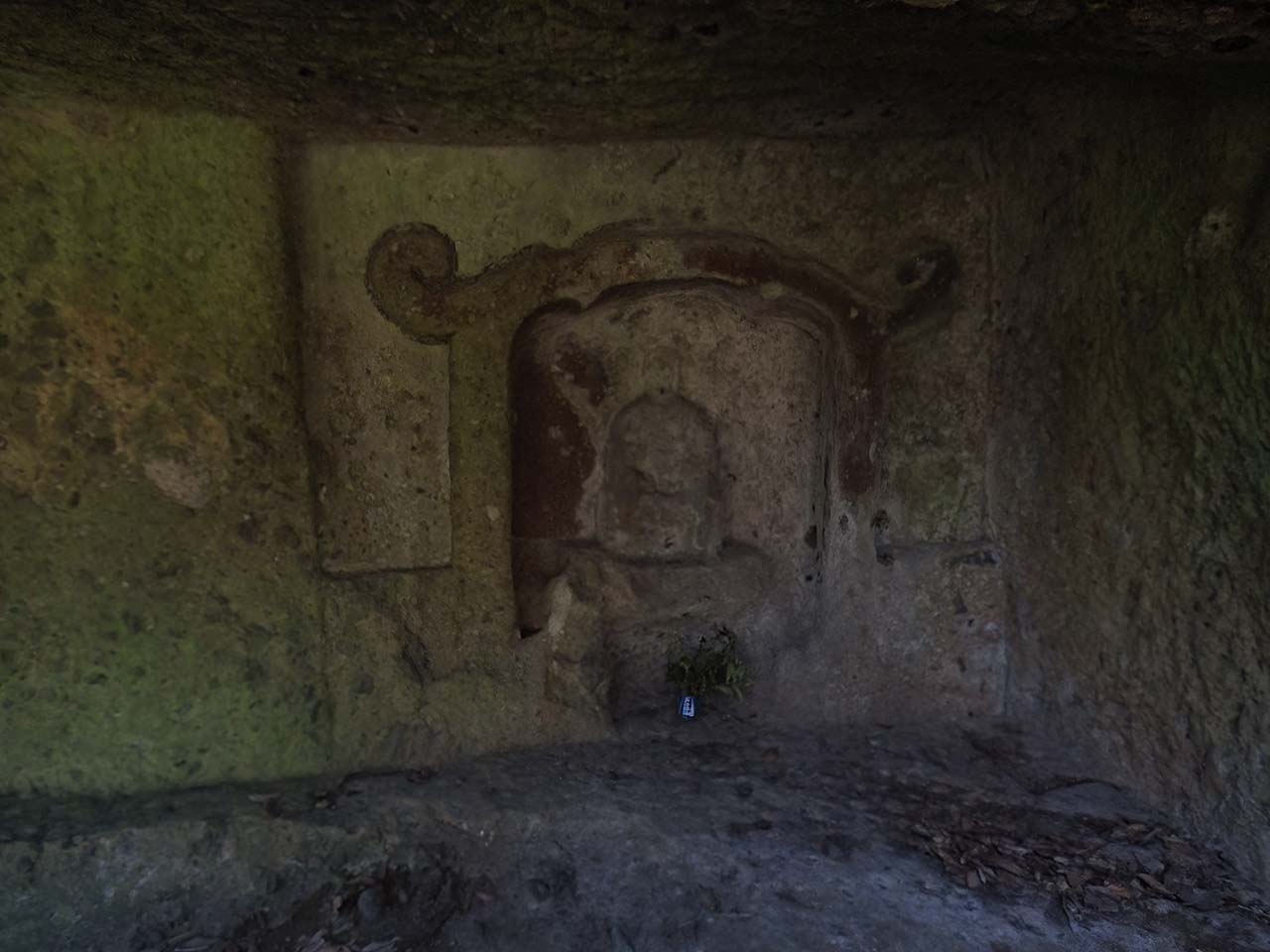 磨崖仏と思われる崖が見えてきた。ここいくつか見てきた、丘陵の頂上部分に掘られた洞窟形式らしい。