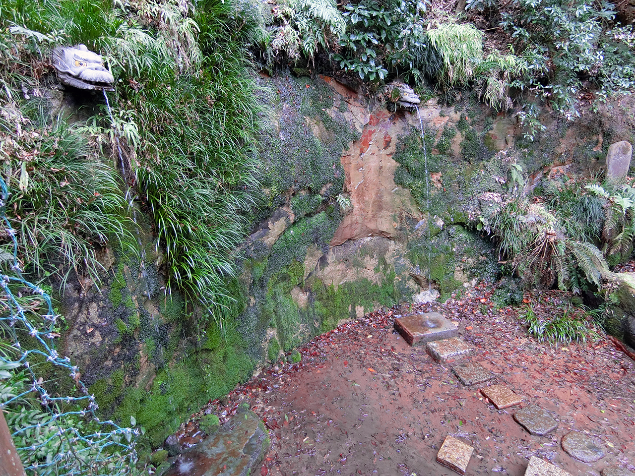 崖の途中の湧水がそのまま竜頭から流れ落ちている。