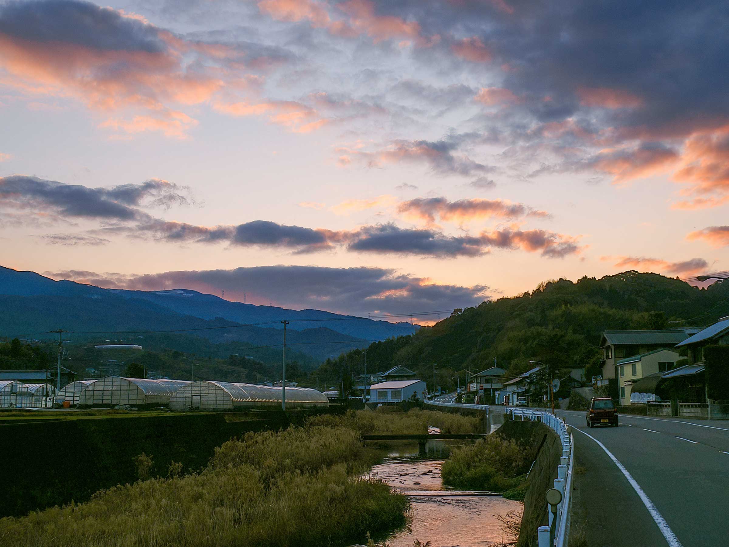 穏やかな山里の冬の夕暮れ。遠くには大河原高原の山並みがシルエットになっている。