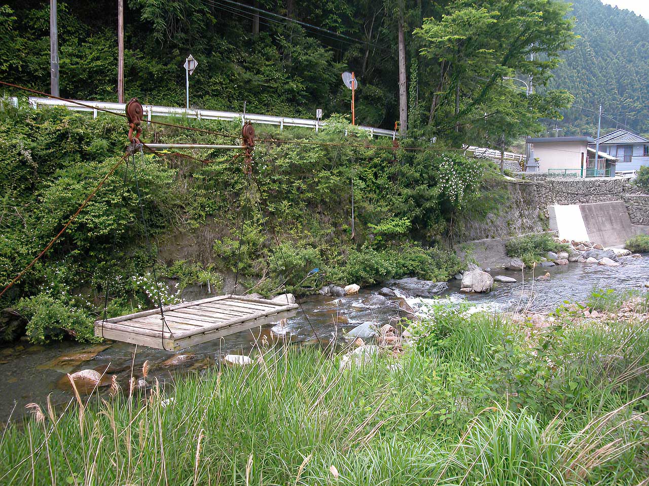 川の両側はV字谷で杉の人工林。平地は谷底にわずかにあるだけで、対岸の土地の持ち主が畑仕事をするために渡る橋だ。