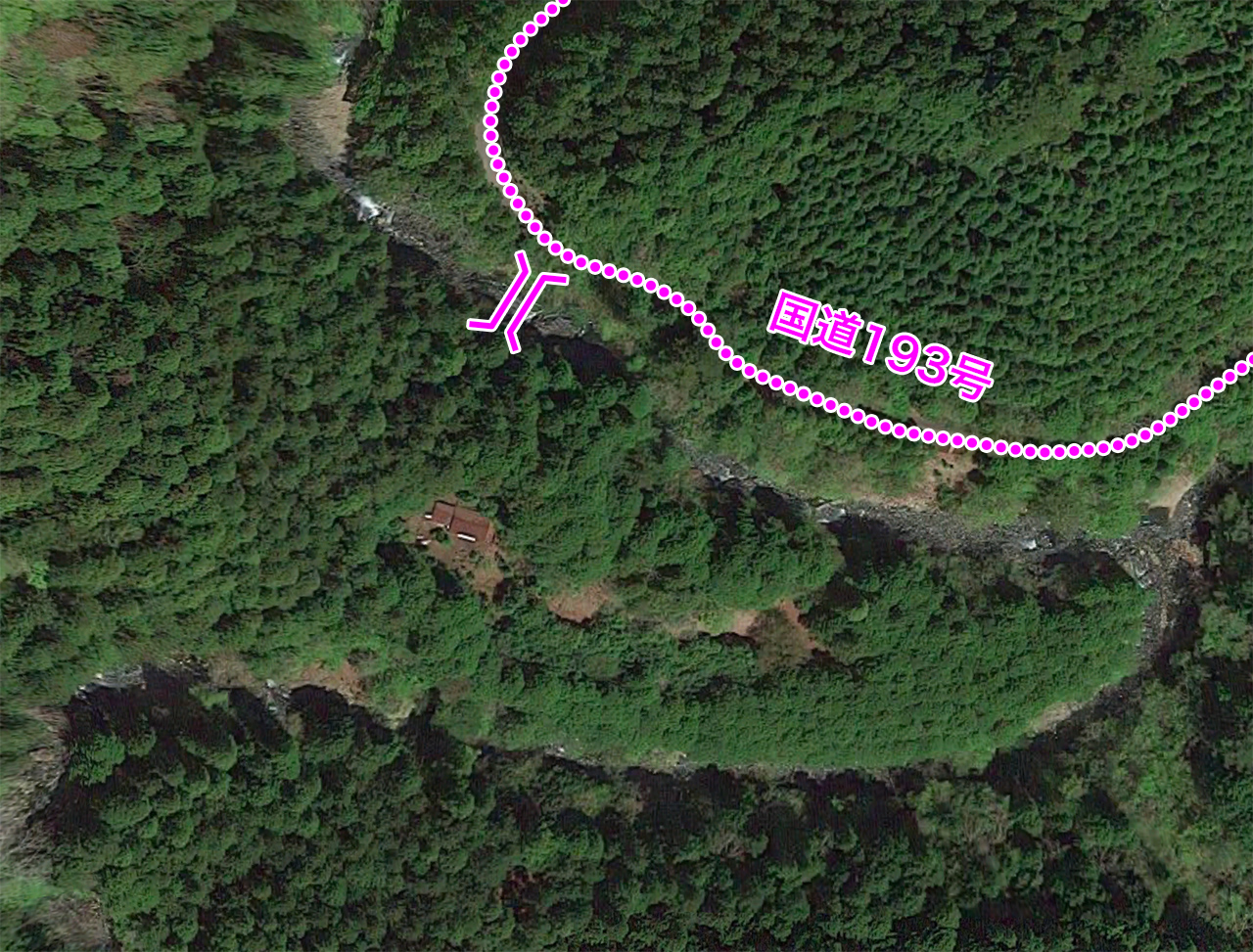 改めて GoogleMaps の衛星写真を見てみたら、この橋の先には人家があるようだ。その家へ行くための橋だったのだ。