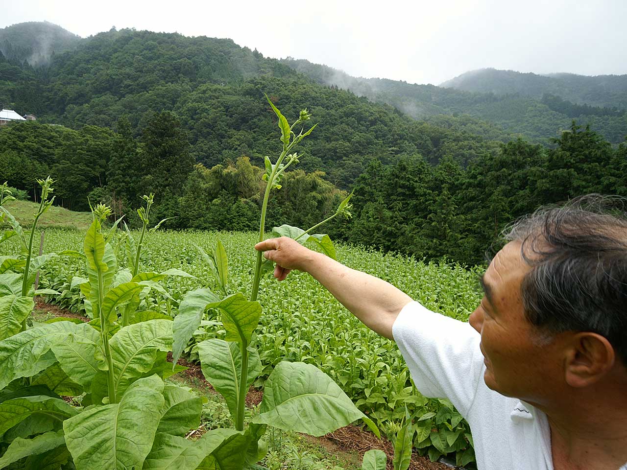 奥のほうの谷には霞みがかかっていて、しっとりとした山の空気に、タバコから揮発するチョコレートのような甘い匂いが混ざっている。とても阿波葉らしい風景の場所だと思う。おそらくこの場所で100年以上はタバコを作り続けてきたのだろう。ナス科の連作というと知らない農家が聞いたら「イヤイヤ、さすがに土壌消毒はするでしょ?」と思うかもしれないが、阿波葉は土壌消毒をせずに連作できる。これが400年間、山間地に適応してきた在来種の力だ。